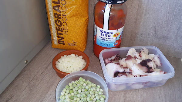 Hoy os traigo una receta de arroz con pulpo y guisantes muy simple de preparar. Empecemos como siempre con los ingredientes para 2 personas: