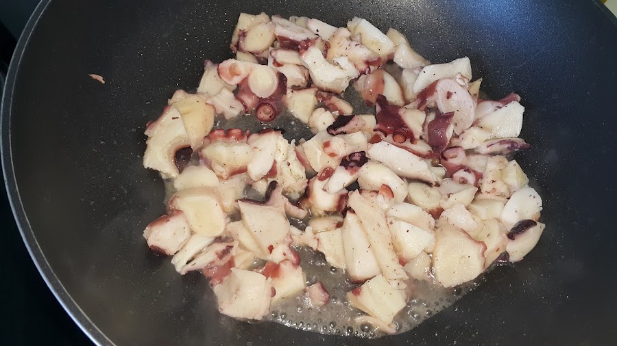 Comenzaremos salteando el pulpo. Si lo compráis fresco deberéis cocerlo primero. En mi caso lo compré congelado y previamente cocido.