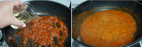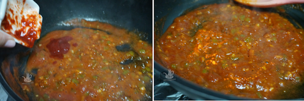 Cuando veamos que el sofrito está listo, añadimos la pasta de la ñora o pimiento choricero mezclamos bien, lo dejamos un par de minutos más. Añadimos el vino blanco, removemos y lo dejamos reducir 3-4 minutos.