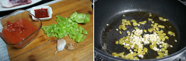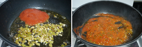 Preparamos el sofrito. Picamos el pimiento verde pequeñito y los dientes de ajos. Añadimos un poco más de aceite si hace falta, incorporamos el pimiento verde, lo dejamos unos minutos y añadimos los dientes de ajos, rehogamos todo junto y seguido añadimos el tomate triturado, lo dejamos se cocine el sofrito.