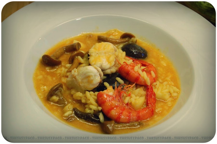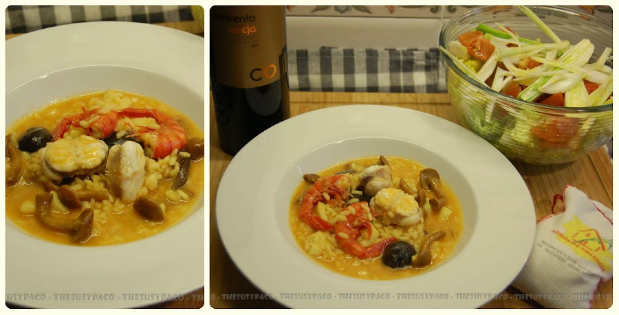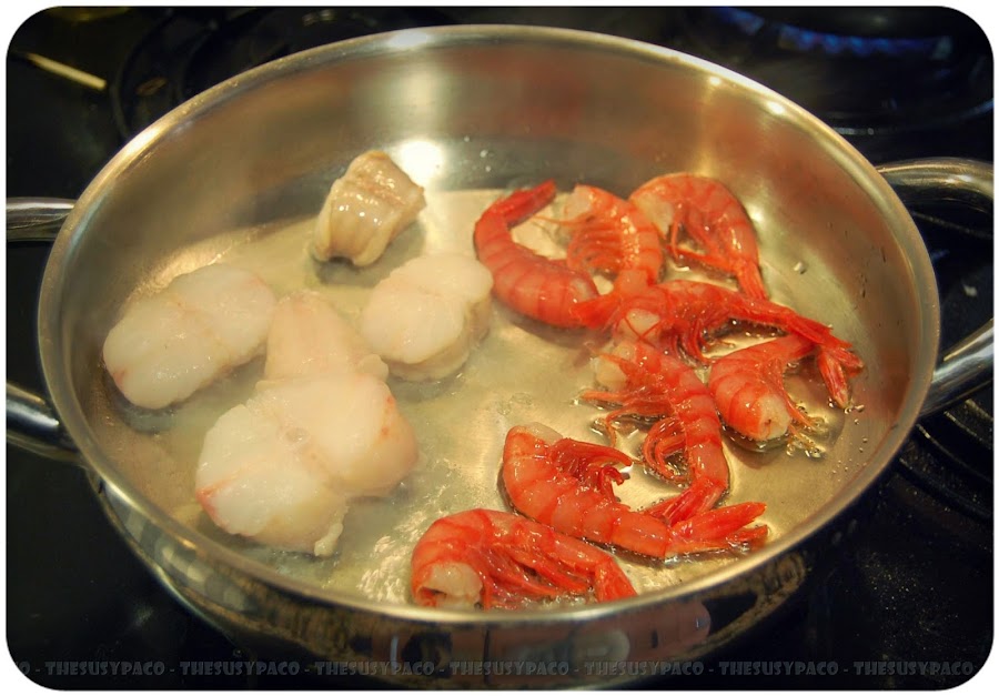 ~ En total tardará de 16 a 18 minutos en estar a punto. Cuando falten unos 3 minutos añadimos el pescado y las gambas. Lo justo para que se terminen de cocinar, el sabor ya está en el caldo y no queremos un pescado muy hecho