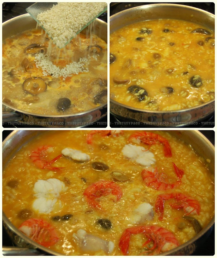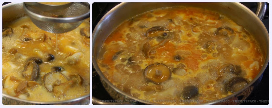 ~ El siguiente paso es añadir el caldo pasado por el colador y dejar unos minutos para que las setas desprendan su aroma