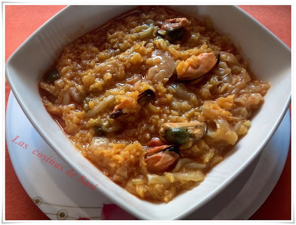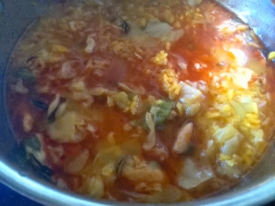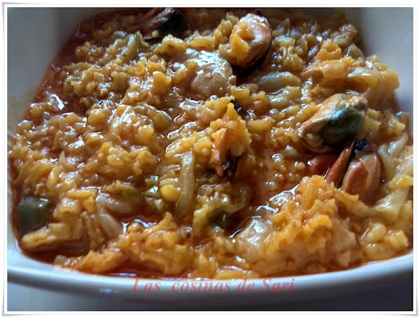 Necesitamos esos mejillones que nos han sobrado y a los que que habremos quitado las conchas, un poco de repollo, una taza de arroz, media cebolla,un ajo, pimiento verde, sal, una hoja de laurel, un chorrito de aceite y la salsa de los mejillones.