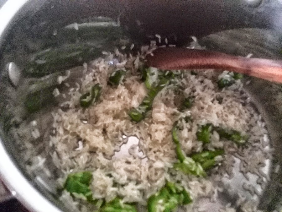 Cuando empiece a tomar color añadimos una taza de arroz y rehogamos para tostarlo un poco.