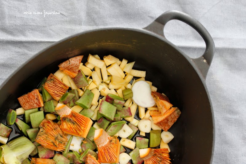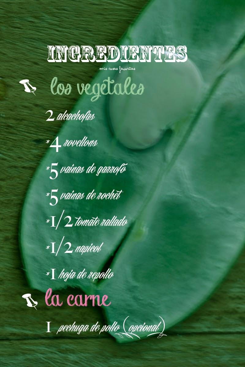1.- Trocea el napicol (si no tienes usa nabo o chiribía), trocea el rochet (puedes sustiruirlo por judía verde), extrae el garrofó de la vaina (puedes sustituirlo por jabones, fabes?todos los que he mencionado arriba), limpia las alcachofas y las troceas en cuatro partes.