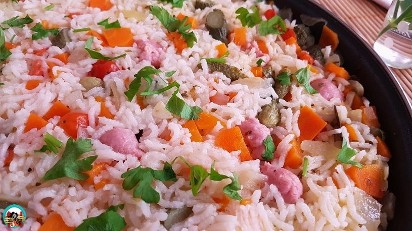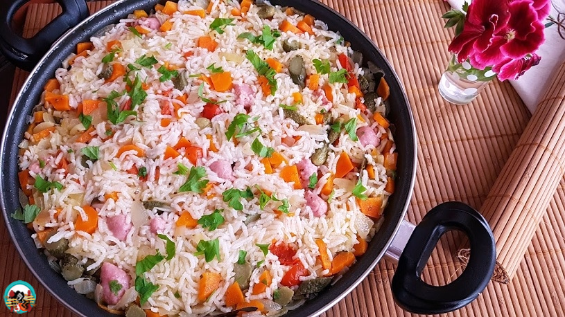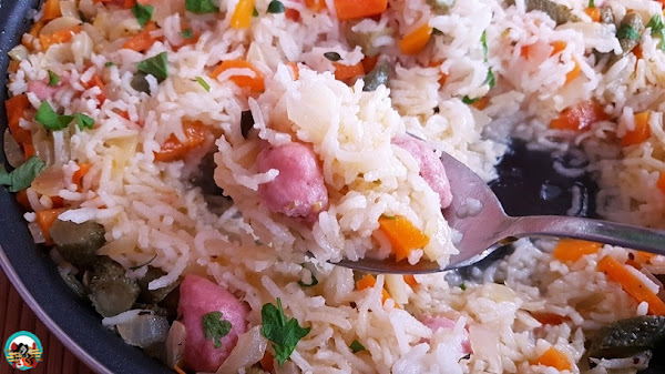 Arroz con salchichas de pollo