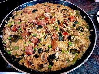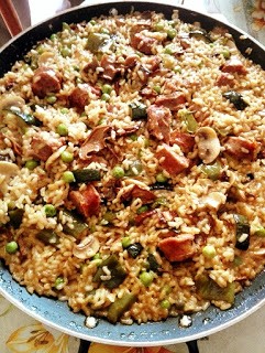 Agregar el agua o caldo cocer a fuego medio, a los 10 minutos agregar las salchichas cortadas y el pimentón, y en los 5 últimos minutos incorporar los guisantes cocidos y los ceps escurridos.