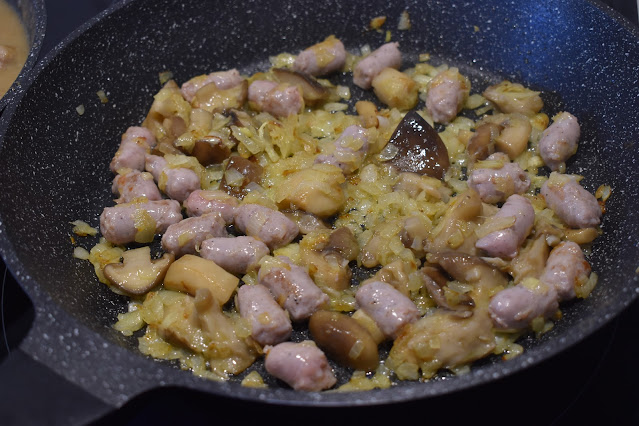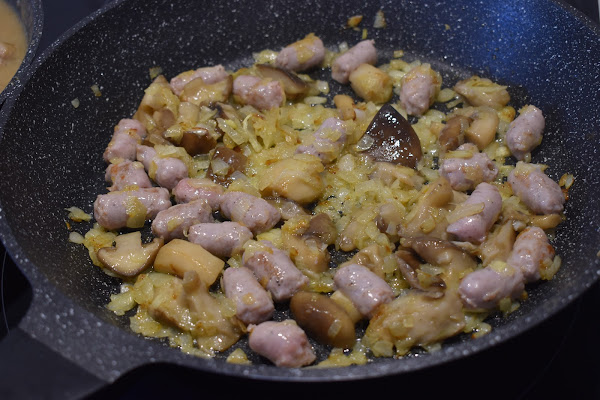 Freímos la cebolla, cortamos las salchichas a trozos y las añadimos.
