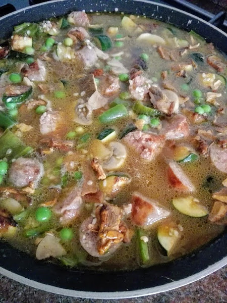 Rectificar de sal si es necesario. Dejar cocer a fuego medio 15 minutos. A continuación añadir las setas y cocer 5 minutos más.