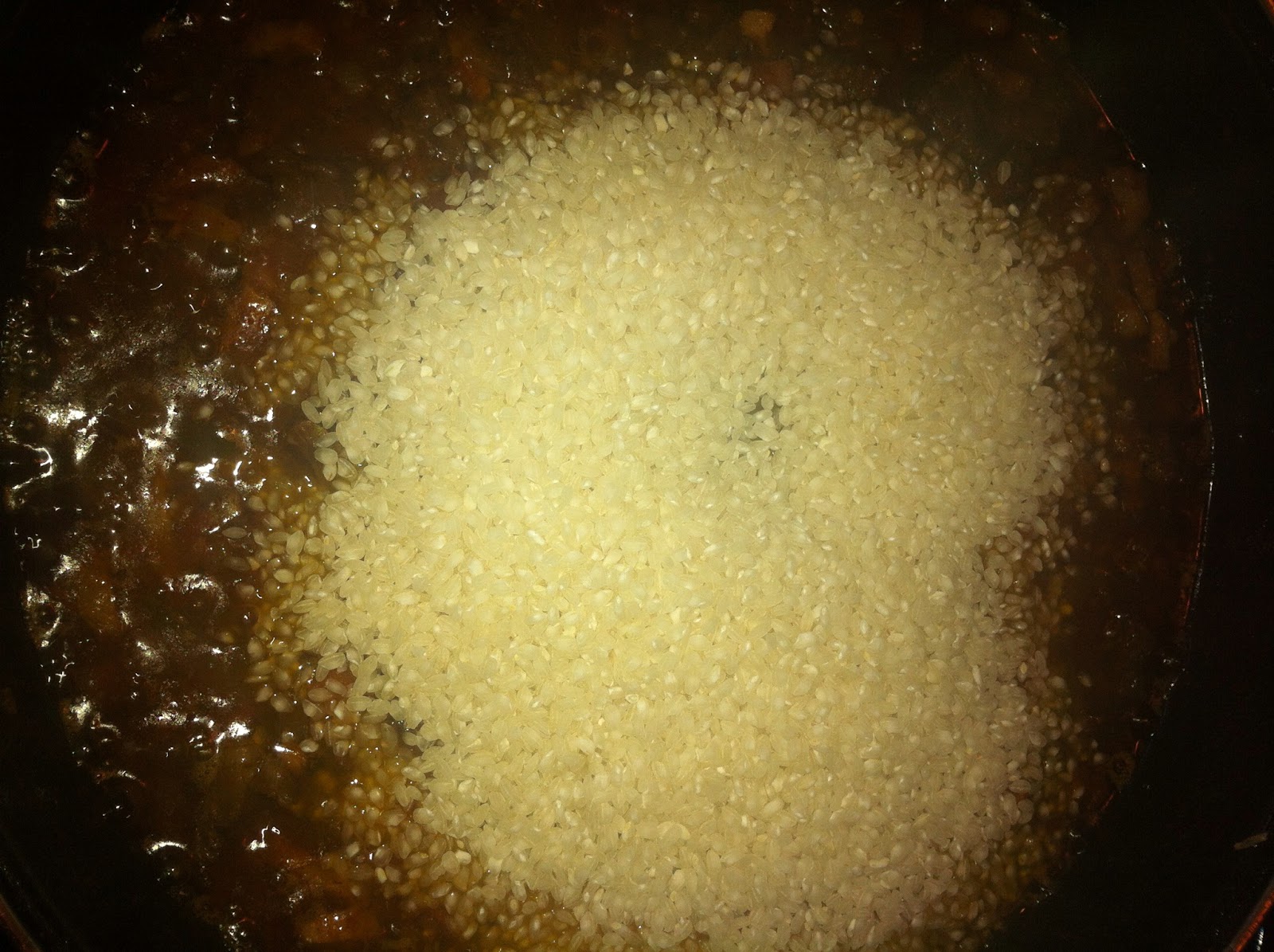 Nota: Una vez empieza a cocer el arroz, no remóvais el arroz con una cuchara, sino menear un poco la cazuela. Si veis que se queda sin líquido, añadir más caldo/agua poco a poco.
