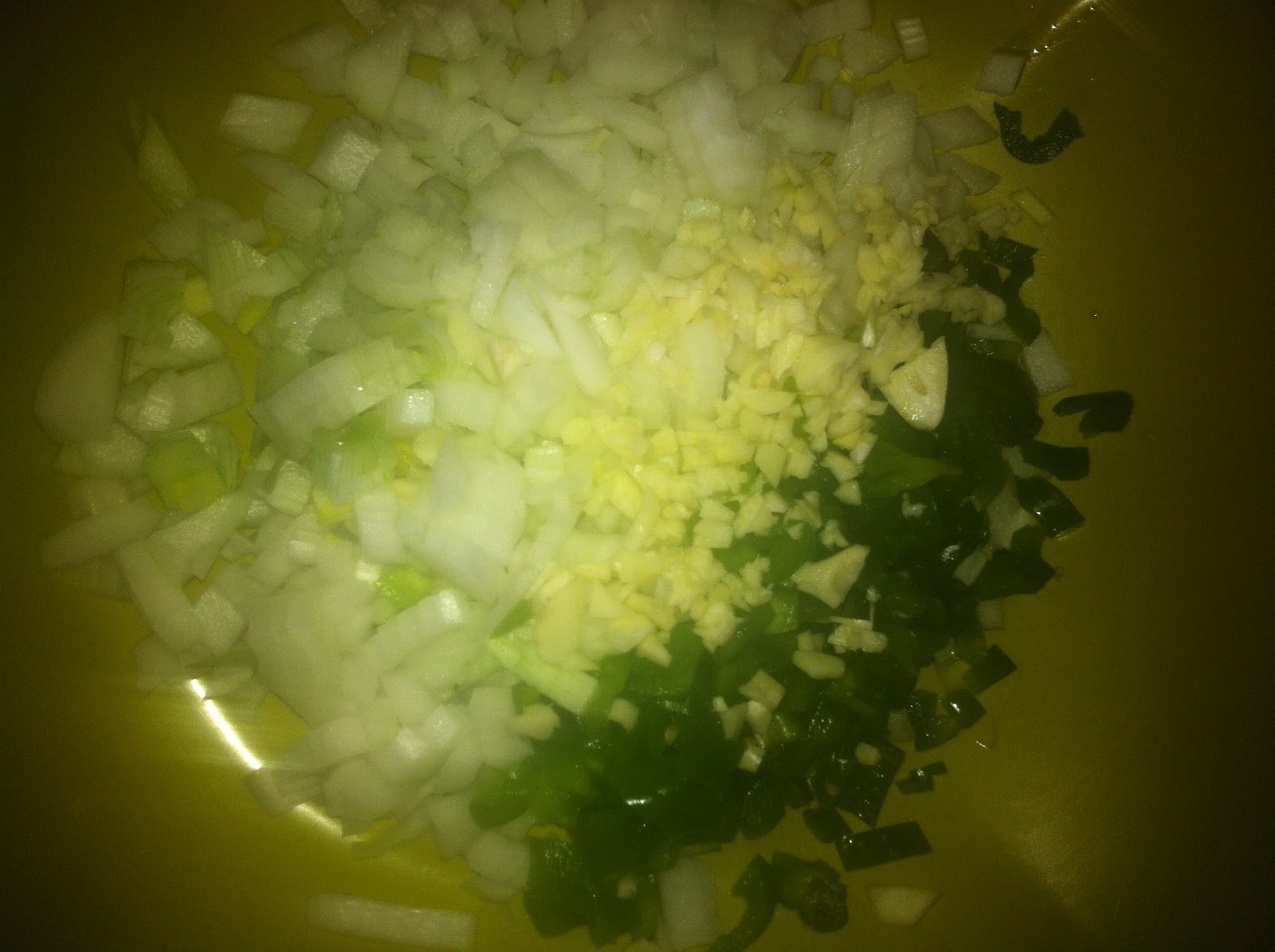 Ahora picamos la cebolla, el 1/2 pimiento verde, los dos dientes de ajo y el bacon cortado en bastoncitos y los ponemos a pochar en la misma cazuela y en el mismo aceite donde hemos dorado las salchichas durante unos 15 minutos a fuego medio o hasta que veáis que está la cebolla