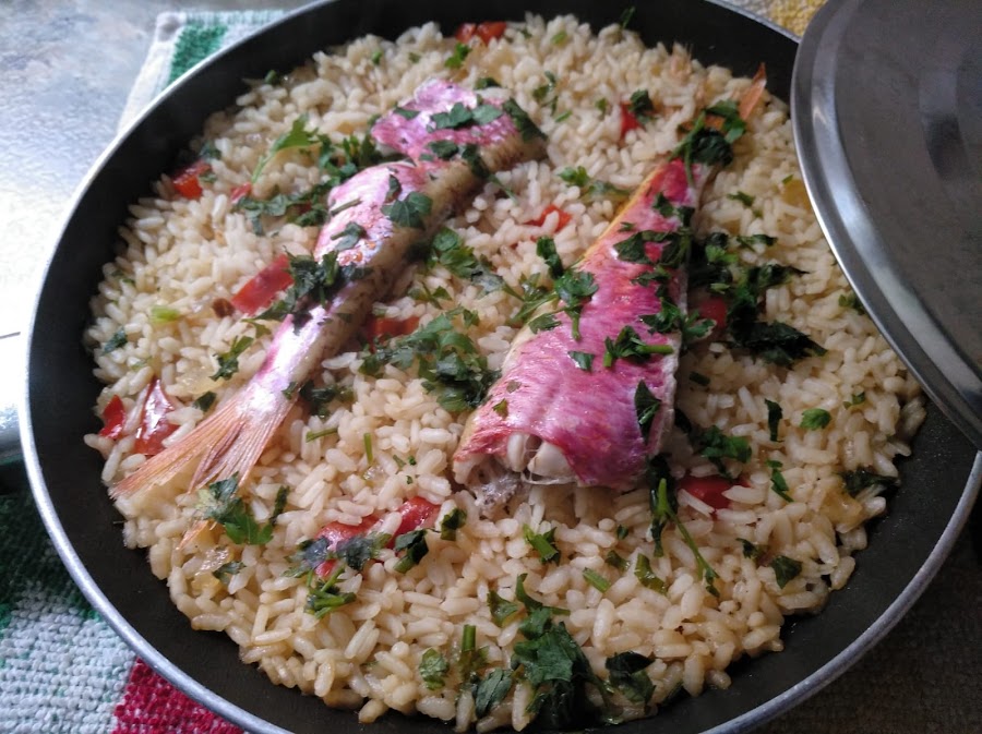 Subimos el fuego y dejamos que se vaya evaporando el caldo poco a poco hasta que veamos burbujitas, pero aún quede un poco de agua sobre el arroz, ya se verá espesa por el almidón. En ese momento, colocamos los salmonetes sobre el arroz y tapamos.