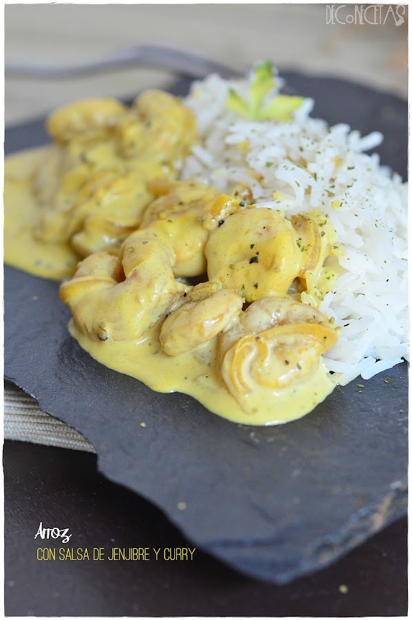 Primero echamos una cebolla cortada en juliana en una sartén a la que añadiremos las gambas descongeladas hasta que veamos que cambian de color, en ese momento añado 50 mililitros de brandy y flambear. Por último añado una cucharada de jengibre en polvo y otra de curry en polvo también y 200 mililitros de nata (crema de leche) para cocinar. Dejamos cocer durante 5 minutos a fuego bajo y ya lo tendremos listo