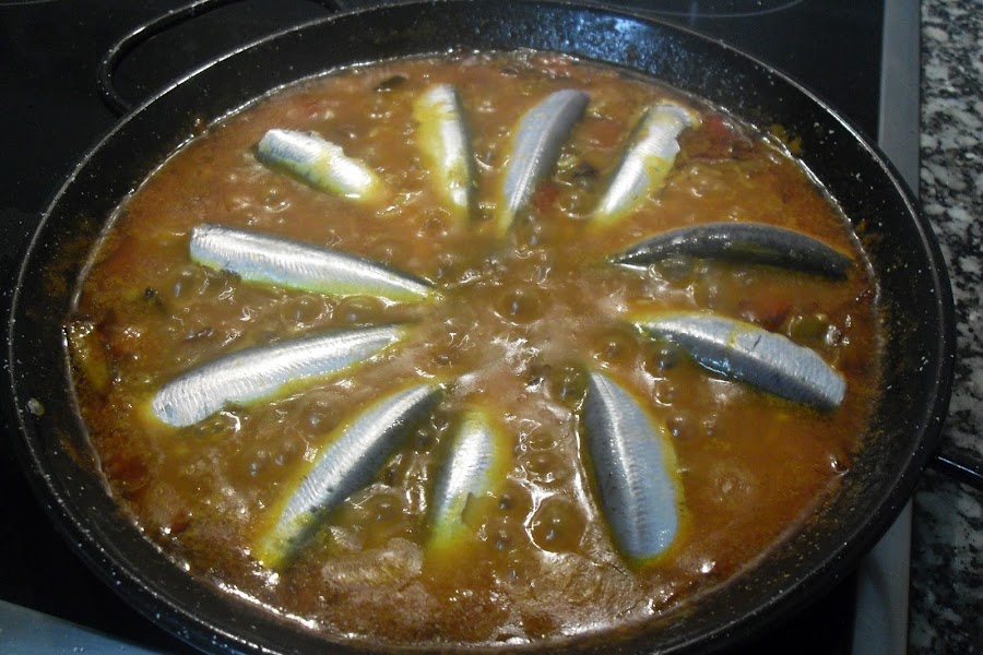 Añadir las sardinas enteras, (sin tripas ni cabeza sin son pequeñas, si son grandes partidas en dos), y dejar cocer 8 minutos más. Tapar.