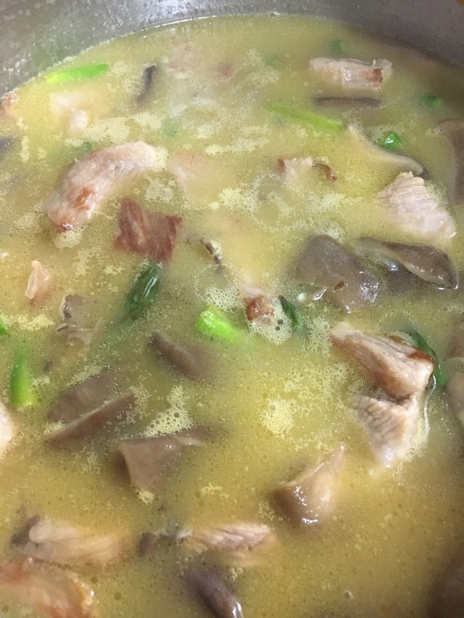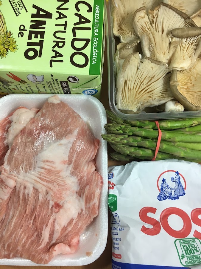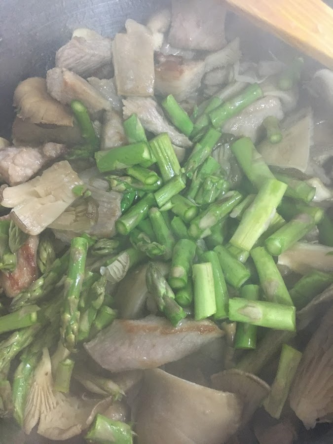 Se añaden las setas limpias y cortadas en trozos a la cazuela y se rehogan unos instantes. Hacer lo mismo con los espárragos trigueros.