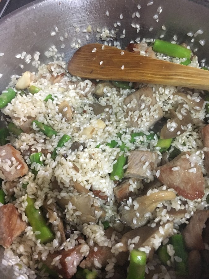 Una vez sofrito, se añade el arroz, se remueve con una cuchara de madera para que se selle el grano de arroz.