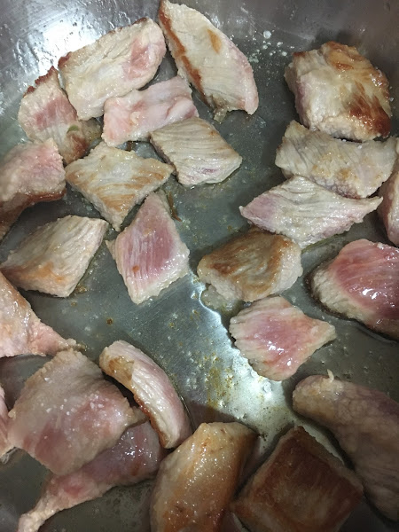En lugar de magro de cerdo elegí el meloso secreto ibérico, pieza del cerdo llamada así por lo escondida que está o bien porque los carniceros se guardaban el secreto de esta pieza para comerla en casa... En casa nos gusta mucho, incluso hecha, simplemente a la plancha.