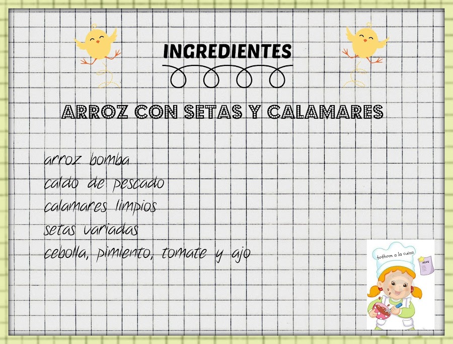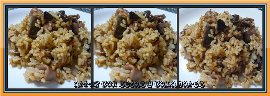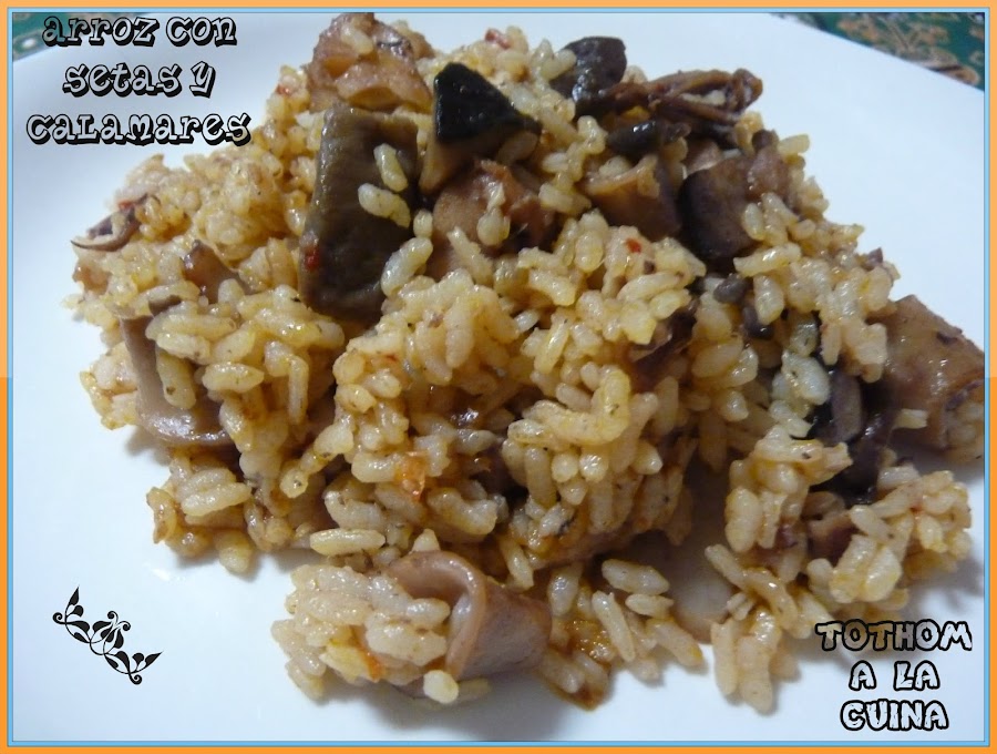 Preparar el caldo de pescado como tengáis costumbre. Saltear las setas variadas (yo tenía de las que venden en un paquete congeladas). Reservar. Los calamares limpiarlos, cortarlos en rodajas gruesas y saltear. Reservar. Preparar un sofrito con cebolla, pimiento, tomate y ajo. Cuando esté en su punto, mezclar las setas reservadas y los calamares. Colar el caldo y reservar. Si hay trozos de pescado que podáis aprovechar, añadirlo también al sofrito. Sofreir el arroz bomba para mezclar los sabores con el sofrito. Añadir el caldo de pescado reservado y rectificar de sal. Retirar del fuego cuando tenga el punto que os guste.