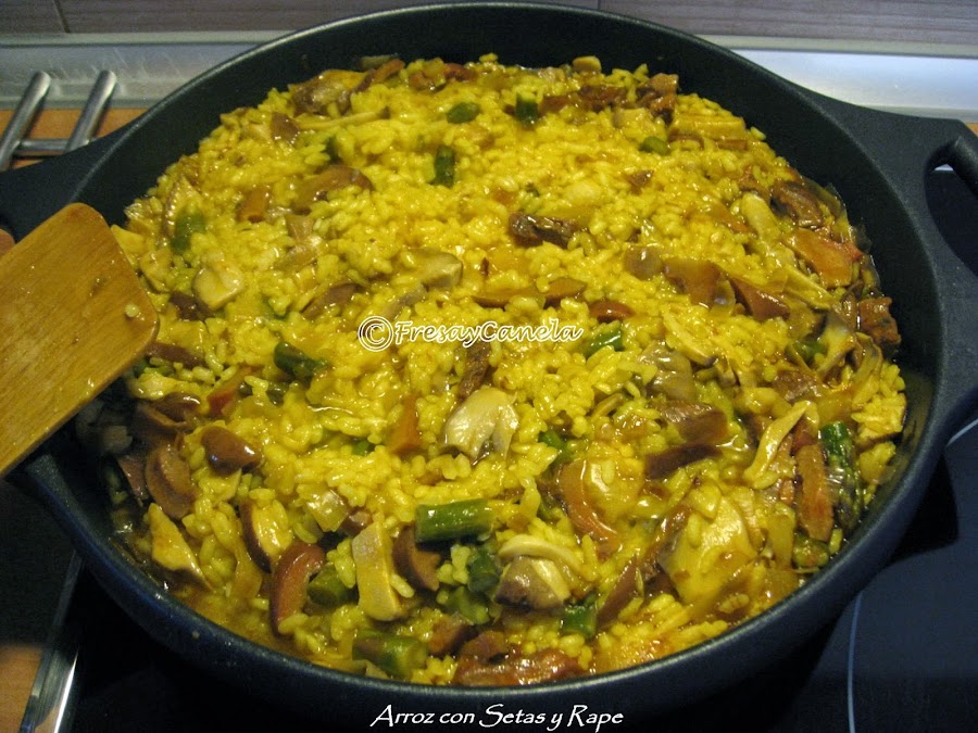 Elaboración:Cubrimos el fondo de una paellera de AOVE y cuando esté caliente echamos la cebolla picada que vaya pochando, cortamos el puerro y lo añadimos junto con los espárragos, cuando tengan buen color las verduras añadimos el tomate triturado, si no tenemos podemos poner también un par de cucharadas de tomate frito, si es casero mucho mejor. Cuando empieza ha estar blandito añadimos las setas y los boletus y dejamos rehogar bien para que el sofrito se impregne del sabor de los hongos y para que suelten su agua. Ponemos el arroz (la cantidad dependiendo de los comensales), los cachetes de rape y rehogamos todo el conjunto. Añadimos el agua, que este caliente para no cortar la cocción, ya sabéis el doble de agua que de arroz, aunque algunos arroces como el bomba requieren más del doble de agua, agregamos desecha una pastilla de avecrem (esto suelo hacerlo cuando no tengo caldo o fumet preparado), azafrán o colorante y rectificamos de sal.