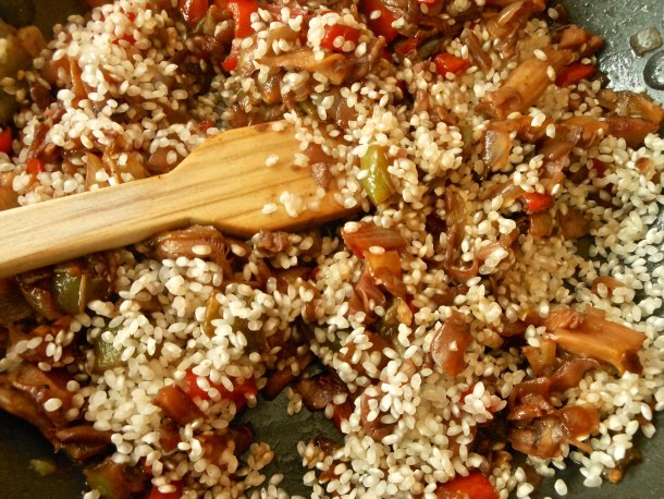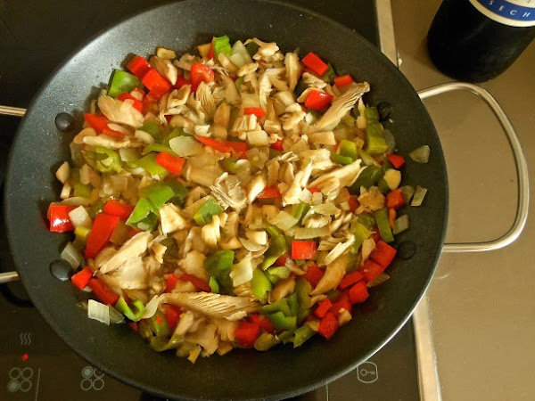 Cuando las hortalizas estén tiernas incorpora las setas a la paellera, añade un poco más de sal fina y sube el fuego a temperatura media-alta, nº 8 de la placa vitrocerámica.