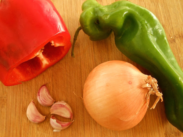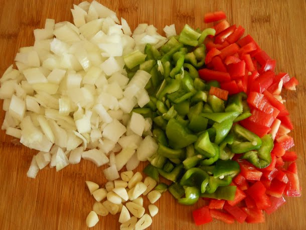 Después elimina las pepitas y trocea los pimientos en trocitos pequeños.