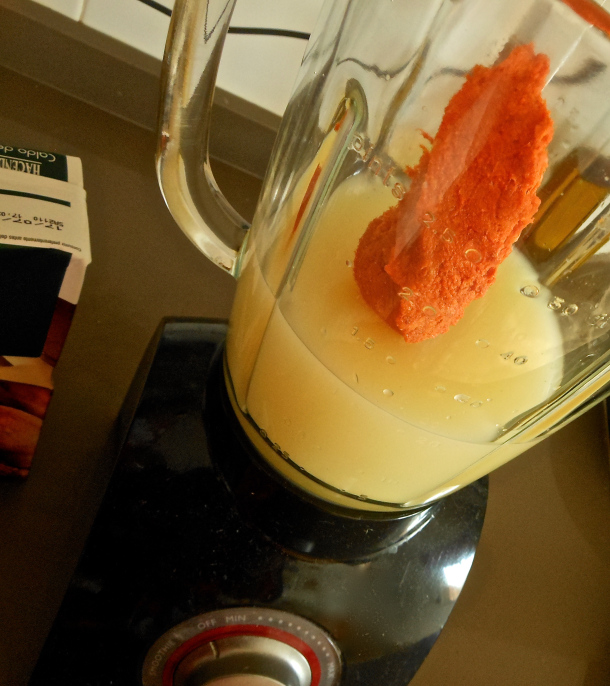 Mientras tanto vierte el caldo de pollo en el vaso de tu batidora eléctrica y añade la sobrasada.