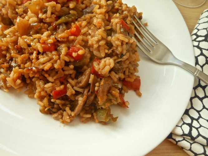 Vino tinto, yo usé un Rioja el mismo que tomamos acompañando al arroz, 1/2 vaso