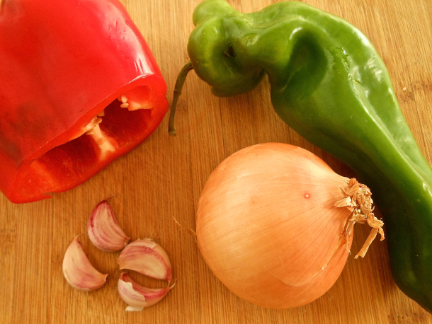 Cuando los dientes de ajo estén dorados, introduce la cebolla y los pimientos troceados en la paellera junto a una poquita de sal fina y deja que las hortalizas se ablanden por espacio de 12 minutos.