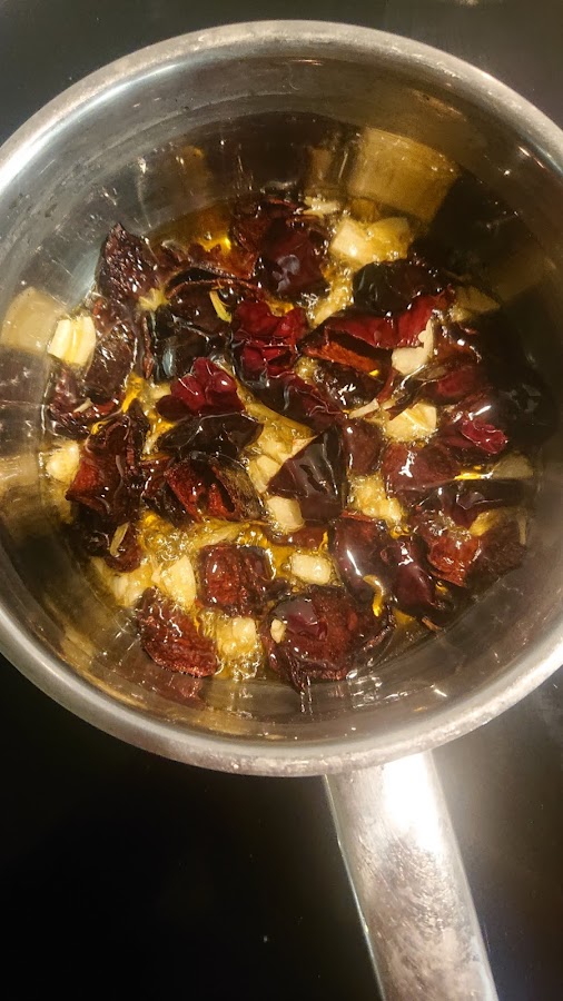 Ponemos el aceite en un cazo y añadimos las ñoras. Calentamos. Y cuando empiece a chisporrotear añadimos los dientes de ajo.