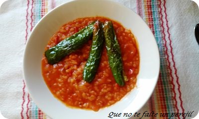 Sirve el arroz acompañado de las tiras de pimientos verdes fritos.