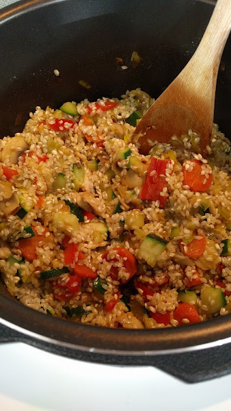 Incorporamos el caldo y las especias y rectificamos la sazón. Mezclamos bien y cerramos la olla. Programamos menú arroz (yo al dente). En cuanto termina despresurizamos pulsando el botón