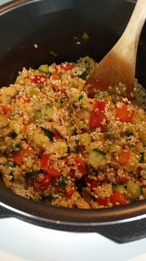 Salamos y dejamos todo junto un par de minutos. Añadimos el arroz, removemos bien y cancelamos el menú