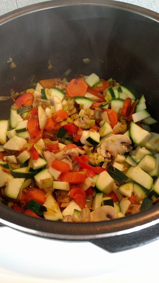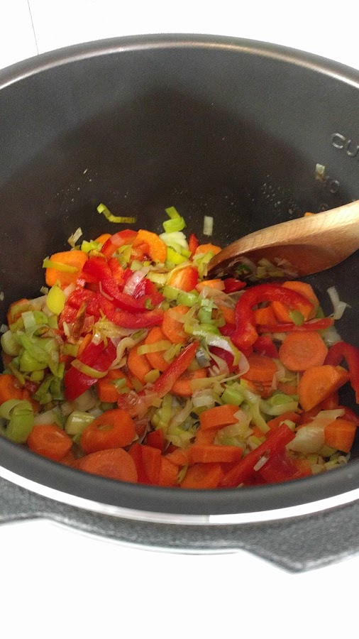 2 vasos y medio de caldo de verduras y/o aguaSeleccionamos el menú freír y ponemos en la cubeta el puerro. Dejamos que se saltee ligeramente y añadimos el pimiento y las zanahorias