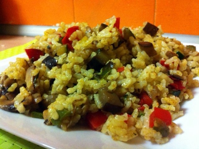 Pochar todas las verduras a fuego medio durante 20 min aprox o hasta que veáis que está suficientemente pochada toda la verdura, salpimentar y añadir el arroz cocido (ya escurrido) y la medida cucharadita de curry. Remover con cuidado la mezcla para que todo el arroz coja el gusto y el color del curry y la verdura se mezcle con el arroz y listo para comer!!!!