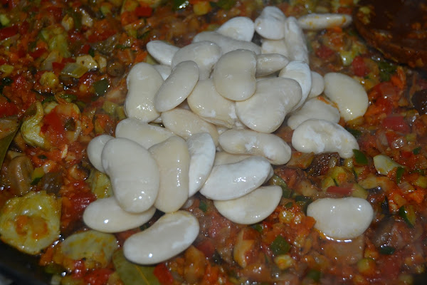 Añadimos el tomate triturado y el garrofón y dejamos cocinar unos minutos.