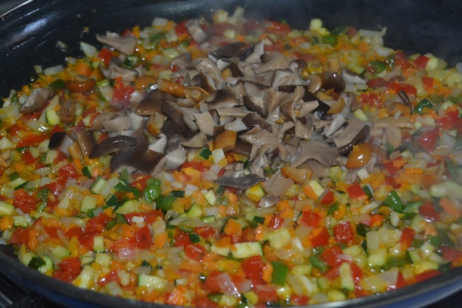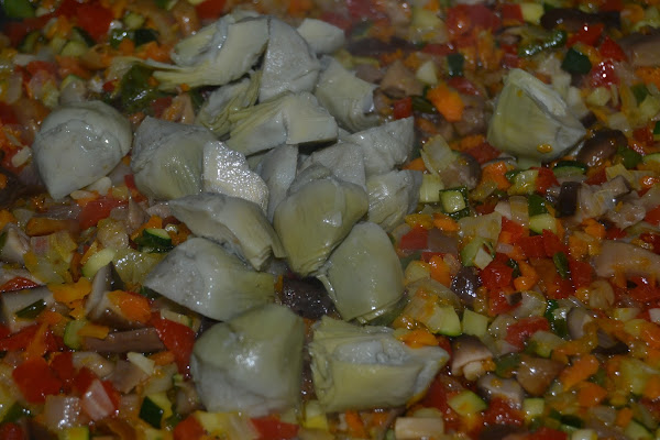 Rehogamos todo y a continuación añadimos las setas y seguidamente las alcachofas.