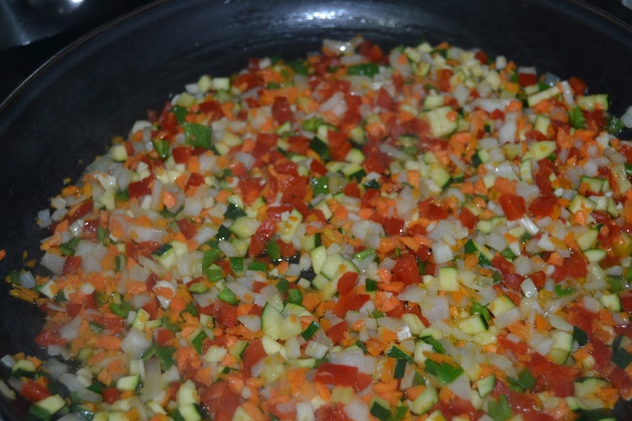 Ponemos el aceite en una paellera o cazuela y echamos los pimientos, cebolla, ajos, calabacín zanahorias y sal.