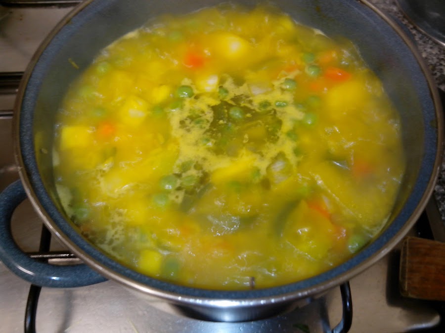Echamos un chorro de aceite en una olla y salteamos durante 5 minutos las verduras picadas con los guisantes. Incorporamos los 2 vasos de arroz, el colorante alimenticio y removemos. A continuación añadimos 5 vasos de agua y sal al gusto. Esta vez no usé el arroz de marca SOS porque siempre me queda muy pastoso. Usé arroz vaporizado (el Brillante "que no se pasa") y las indicaciones del paquete eran 2 vasos y medio de agua por cada vaso de arroz.