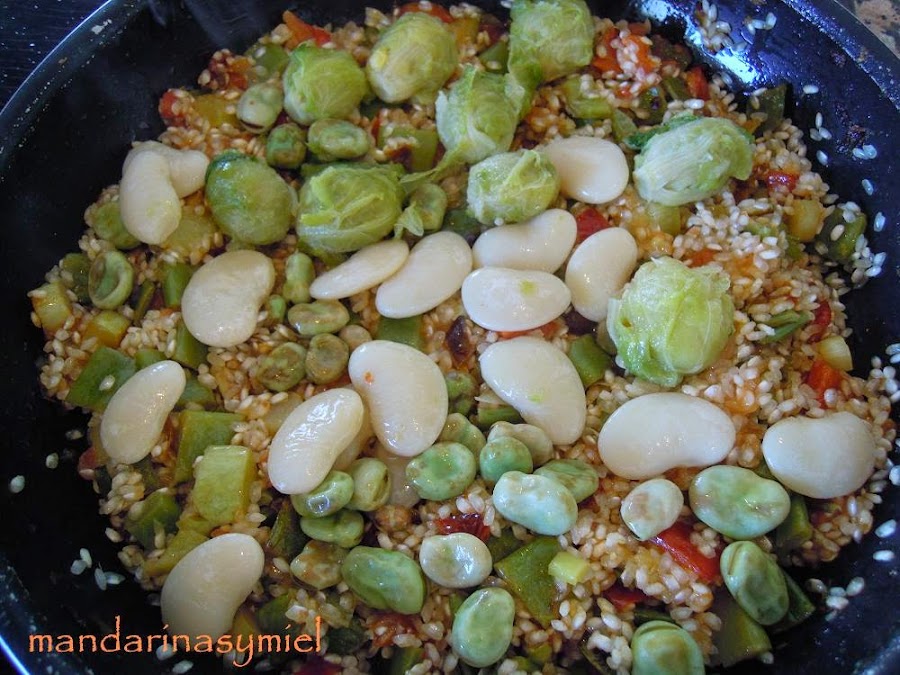 Aunque es domingo y lo normal es hacer una paella con carne y verduras, me apetecía más un arroz solo con verduras, así que he mirado las que tenía en la nevera y en el congelador y aquí está este arroz con verduritas que aunque no lleva nada de carne está muy gustoso.