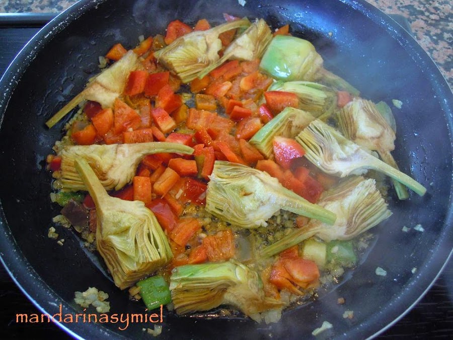 Las alcachofas las quito cuando están fritas para que no se deshagan durante el sofrito de las verduras y las añado con el arroz porque no hierven demasiado rato (como ocurre en la paella con carne, que ya os la explicaré otro día).