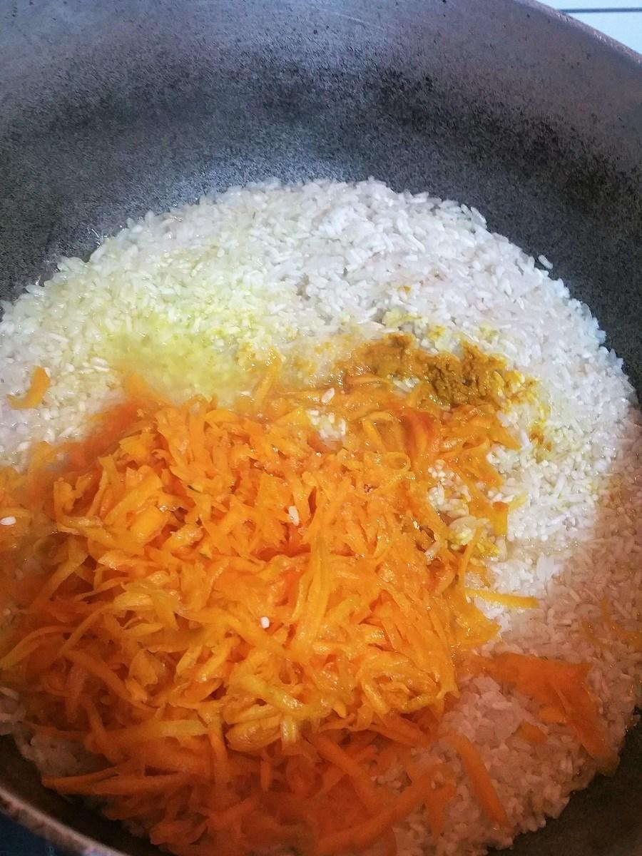 En una olla, calienta el aceite de coco y sofríe el arroz revolviendo constantemente alrededor de 2 minutos.