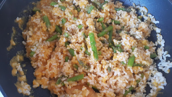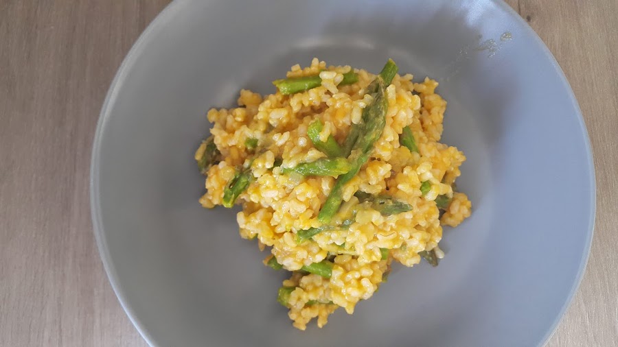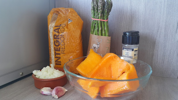 Hoy os traigo una receta muy otoñal, ideal para esta época del año: se trata de un arroz cremoso, tipo risotto con salsa de calabaza y espárragos. Empecemos con los ingredientes para 2 personas: