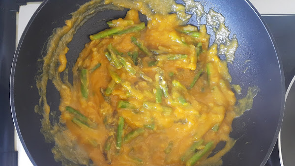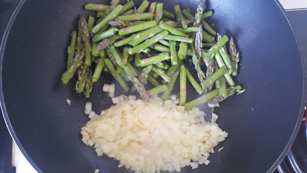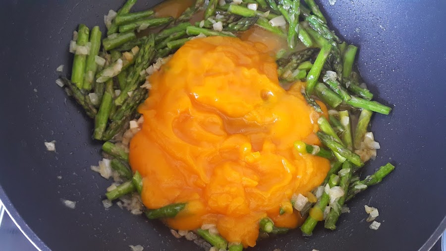 A continuación añadiremos los espárragos cortado a trozos de unos 2 dedos de largo y eliminando la parte final de los tallos más dura. Dejaremos cocinando a fuego bajo unos 10 minutos.