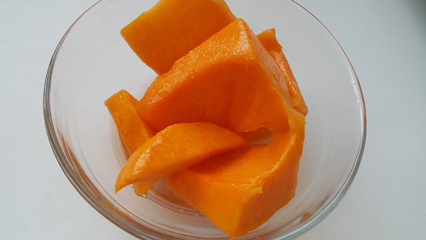 Paralelamente cocinaremos la calabaza en el microondas. Para ello la pondremos en un bol (o recipiente apto para microondas) con medio vaso de agua y un poquito de sal. Cocinaremos en 2 tandas de 7 minutos a 700W. Si lo preferís podéis hervirla o asarla al horno.