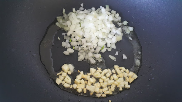 Seguidamente picaremos el ajo y lo saltearemos a fuego bajo en una sartén honda con un poco de aceite. Cuando éste empiece a dorarse añadiremos la cebolla picada y dejaremos unos 5-7 minutos a fuego bajo hasta que la cebolla coja color.