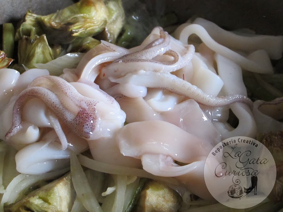 Este arroz está basado en ?ARROZ CALDOSO DE SEPIA CON ALCACHOFAS Y GAMBAS? del Restaurante Casa Pepe de San Juan Alicante, el mío es con calamar porque el día que pensé en hacerlo no encontré sepia de calidad, pero si encontré calamar fresco grande, he puesto también pimiento verde porque me gusta y unas hebras de azafrán que le dan un gusto muy bueno a los arroces.