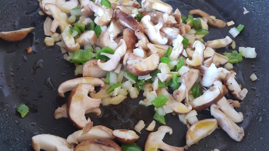 Laminamos las setas y las añadimos pasados unos 10 minutos dejando que las verduras de pochen un poco.