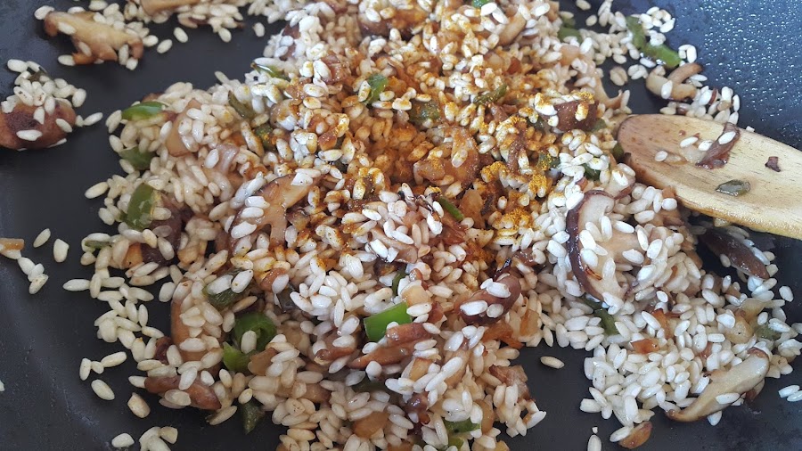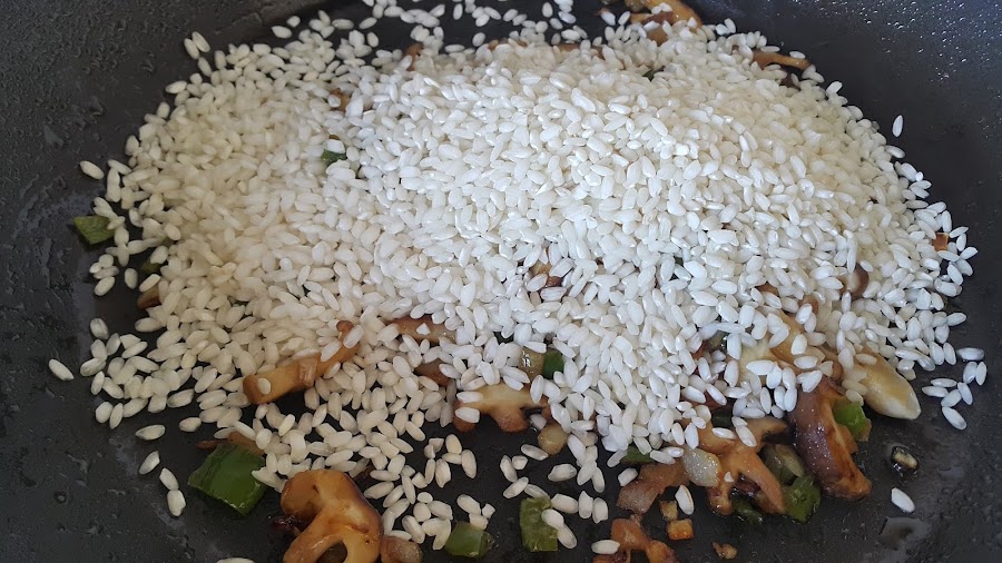 Cuando tengamos las verduras cocinadas añadimos el arroz y lo dejamos sofriendo hasta que los granos pasen de color blanco a translúcido.