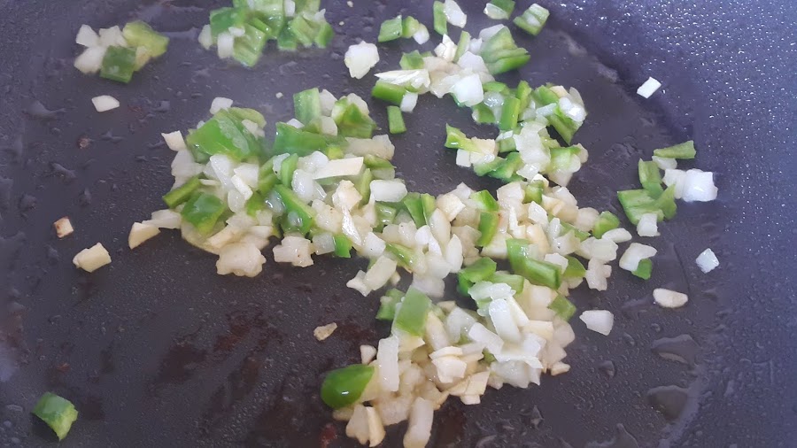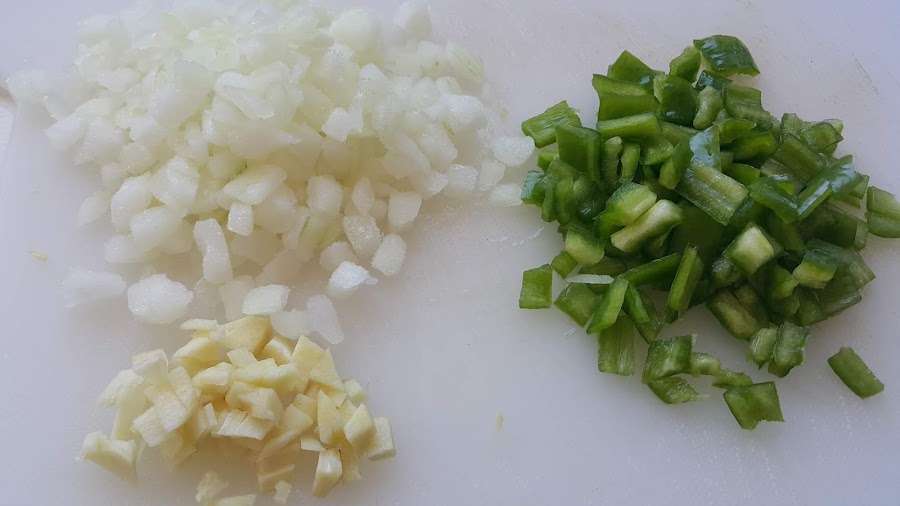 Picamos media cebolla, medio pimiento verde y un diente de ajo.