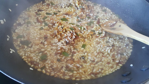 Vamos añadiendo el caldo de pollo caliente a la sartén, de cucharón en cucharón, como si preparásemos un risotto. Dejamos que el arroz vaya absorbiendo el caldo presente antes de añadir más.